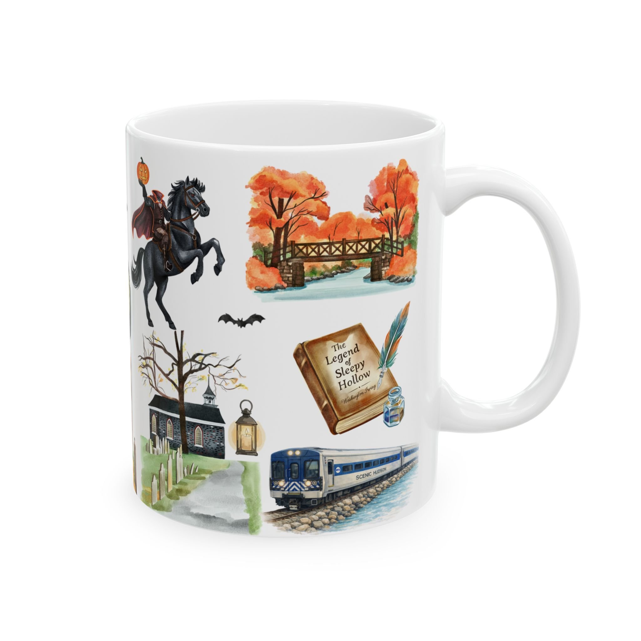 Wrapped in rich watercolor-style illustrations of the village's most iconic landmarks, every side of this mug tells a story. The Tarrytown Lighthouse and Tappan Zee Bridge glowing over the Hudson River, the Headless Horseman riding through the hollow, the Old Dutch Church and its centuries-old cemetery, the Welcome to Sleepy Hollow sign, the Legend of Sleepy Hollow book, and even the Metro-North train - because getting here is half the experience.